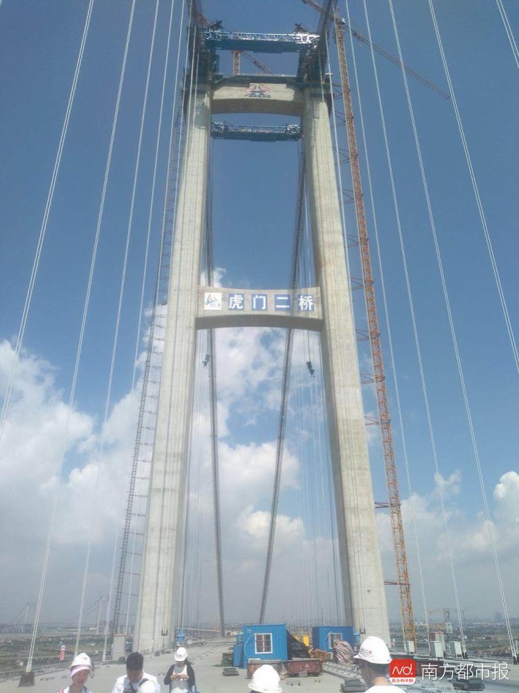 目前,虎门二桥项目进展顺利。桥梁基础、下部结构施工已基本完成,上构施工全面开展施工。大沙水道桥主缆索股架设、钢箱梁吊装、钢箱梁焊接、主缆缠丝均已顺利完成,正在进行主缆防腐涂装、除湿系统安装,即将转入猫道拆除这道高风险工序。坭洲水道桥已完成主缆索股架设、索夹及吊索安装,后续将跨台风期开展钢箱梁焊接以及主缆防护等作业,两道工序预计在今年9月完成。项目将于2019年上半年建成通车。